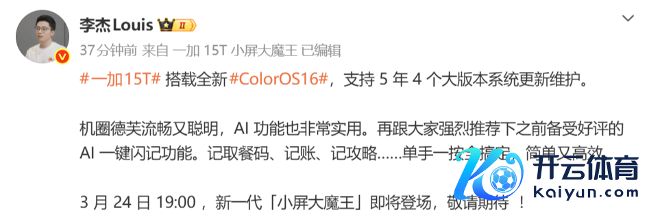 【CNMO科技音问】3月22日欧洲杯体育,一加中国区总裁李杰在酬酢媒体上称,一加15T将搭载全新的ColorOS 16系统,并欢喜提供5年4个大版块的系统更新爱戴。