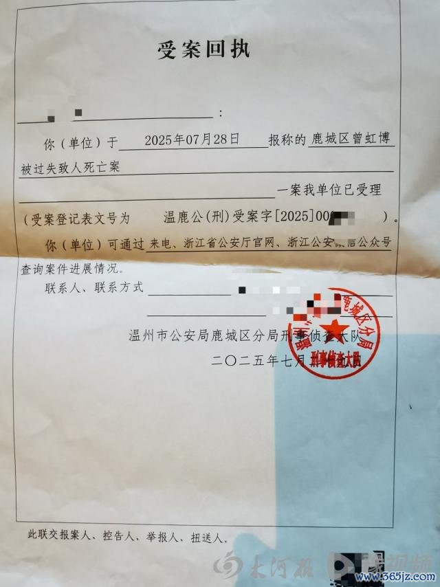 温州市公安局鹿城分别局刑事观望大队 7 月 29 日开具的《受案回执》表露,坠一火男孩家属报称的被过错致东谈主去世案已被受理。